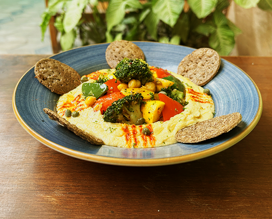 Creamy hummus, Warm sautéed veggies, and crisp ragi chips, Healthy and Oh so Tasty!