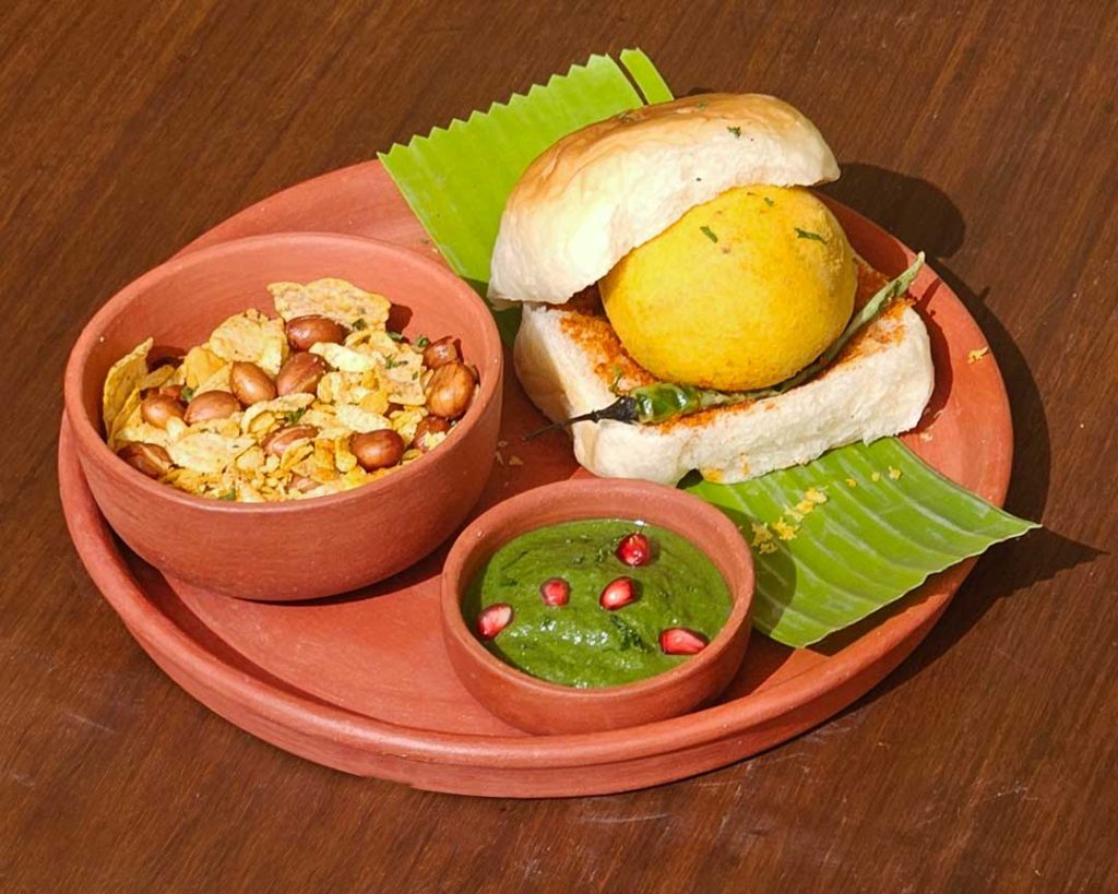 Fresh Potato Vada with Garlic Chilli Powder & green chutney in Pao. Served with Peanut Papad Namkeen & Chutney.